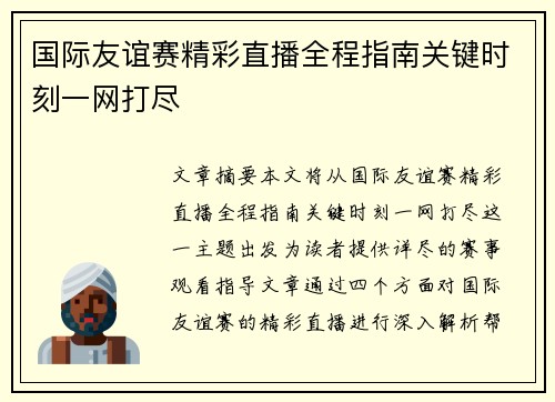 文章摘要:本文将从“国际友谊赛精彩直播全程指南关键时刻一网打尽”这一主题出发,为读者提供详尽的赛事观看指导。文章通过四个方面对国际友谊赛的精彩直播进行深入解析,帮助观众更好地把握赛事中的关键时刻,充分体验比赛的精彩瞬间。首先,文章将介绍国际友谊赛的直播平台选择,如何选择最佳平台来确保观看体验;其次,重点阐述赛事前的预热与分析,如何通过前瞻性分析提高观赛效果;接着,文章将分析关键时刻的呈现方式和观看策略,确保观众不错过每一个重要瞬间;最后,讲解如何通过互动和社交媒体参与,提升赛事观感与互动感。通过这些内容,读者可以全面掌握如何在国际友谊赛中全程体验精彩,享受赛事的每一刻。