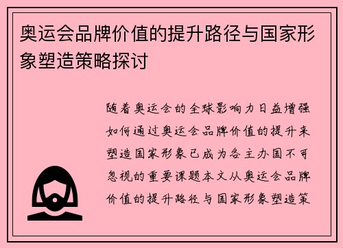随着奥运会的全球影响力日益增强,如何通过奥运会品牌价值的提升来塑造国家形象,已成为各主办国不可忽视的重要课题。本文从奥运会品牌价值的提升路径与国家形象塑造策略两个核心视角出发,探讨如何在全球化背景下利用奥运会这一全球舞台,提升国家的国际声誉与形象。首先,文章将分析奥运会的品牌价值内涵,揭示其与国家形象的密切关系;然后,探讨奥运会如何通过创新的市场营销与传播策略提升品牌价值;接着,结合奥运会举办的实务操作,分析国家如何通过文化交流与城市规划等手段强化自身品牌;最后,针对未来的挑战和机遇,提出奥运会品牌价值提升与国家形象塑造的可持续发展策略。文章旨在为各国主办奥运会提供理论参考与实践建议,助力提升国家的国际话语权和影响力。